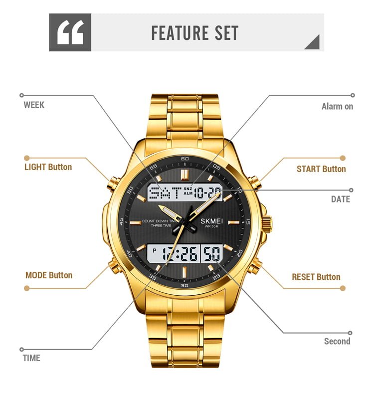 Feature: 3time, chrono,date,week,alarm ,El light,12/24 hour clock,count down timer